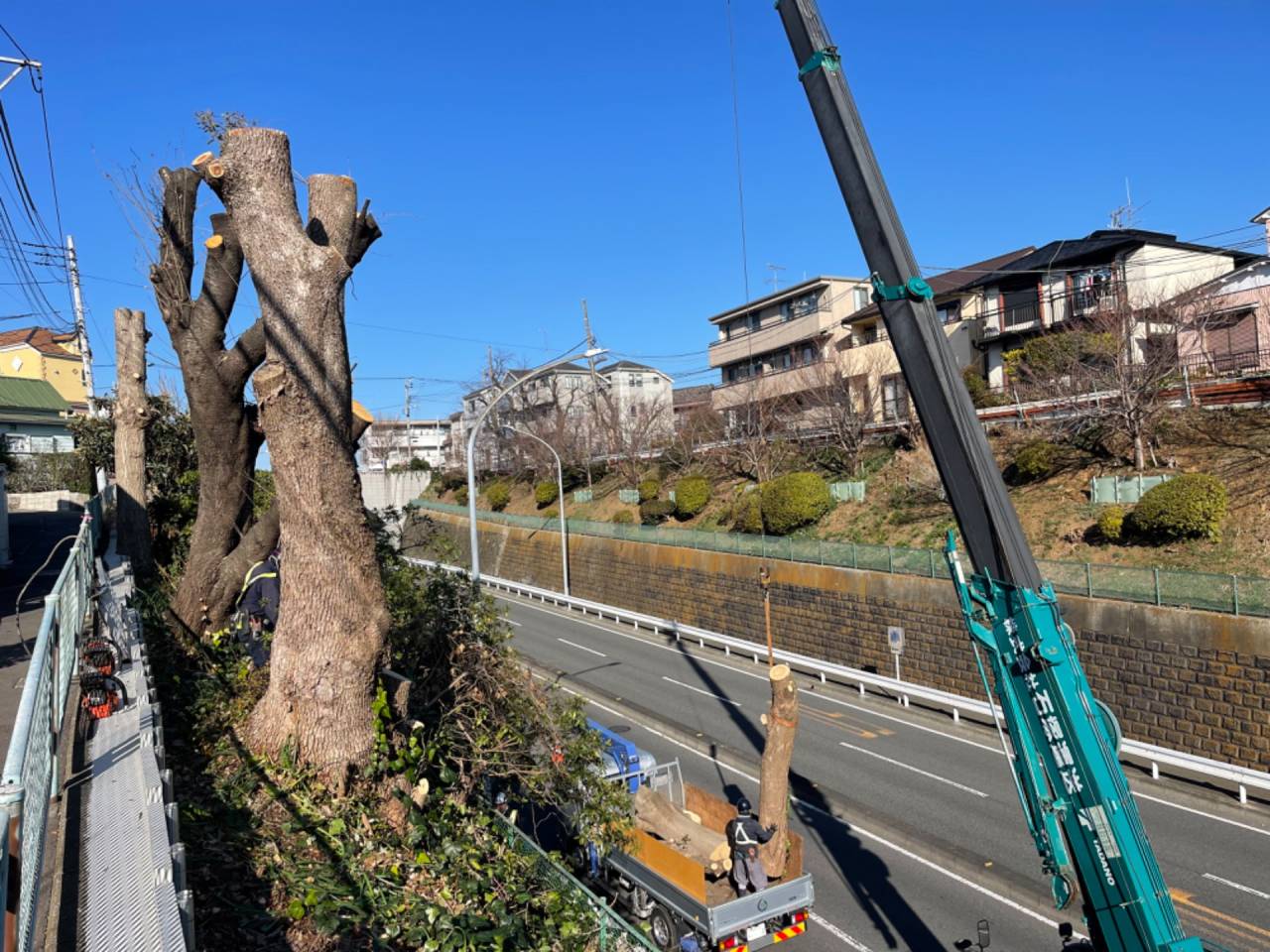 施工実績紹介No.59【横浜市南区三春台】道路用地のサクラ・クスノキ・イチョウ伐採作業を実施|高所作業車・クレーン車を併用した安全施工