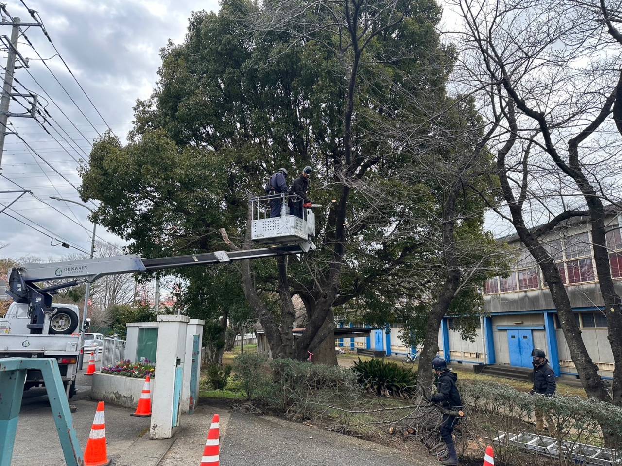 施工実績紹介No.64【横浜市泉区和泉町】学校敷地内のソメイヨシノを伐採|高所作業車を使用した安全施工