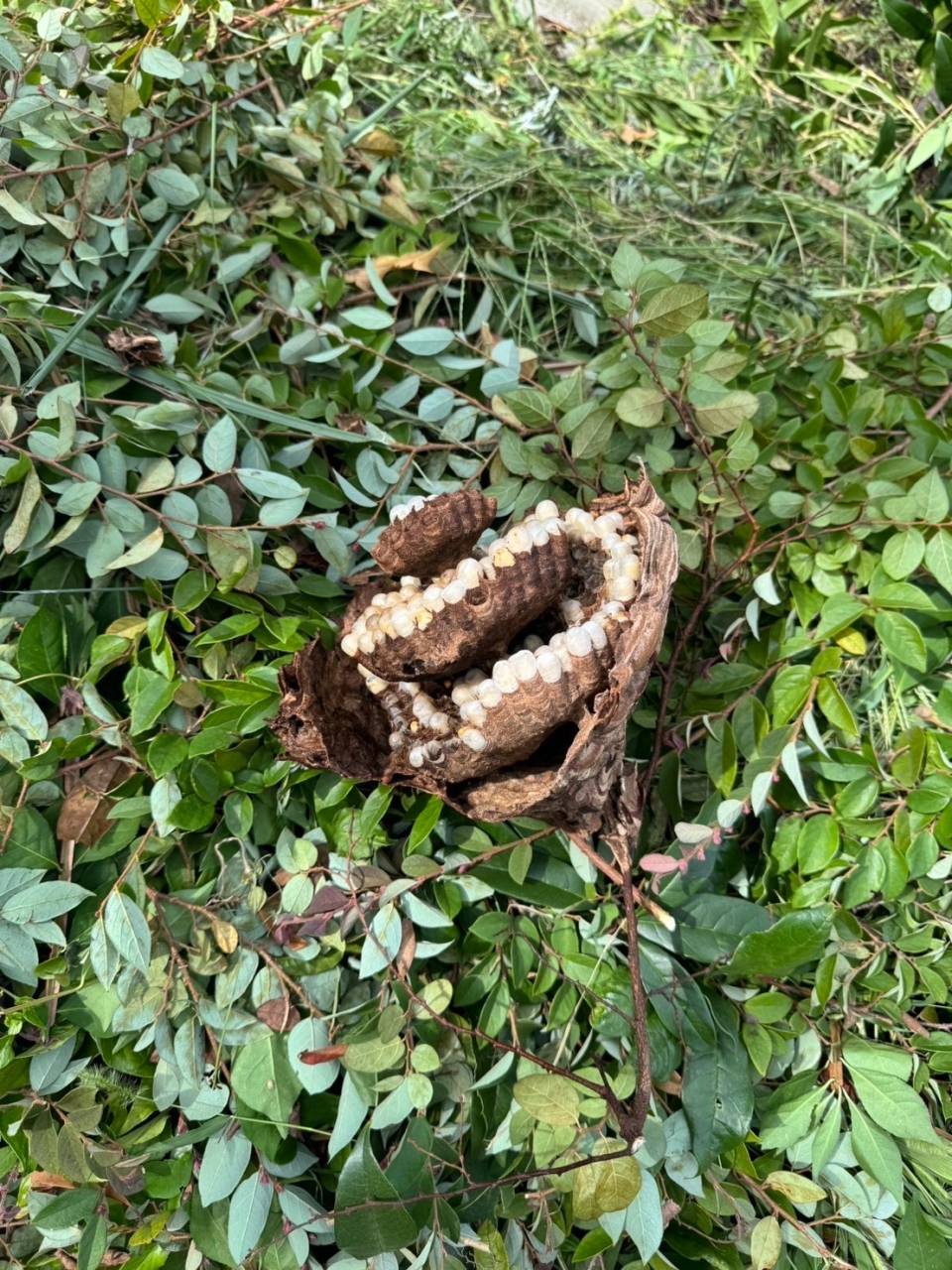 緑道の生垣に作られたスズメバチの巣を安全に除去し、