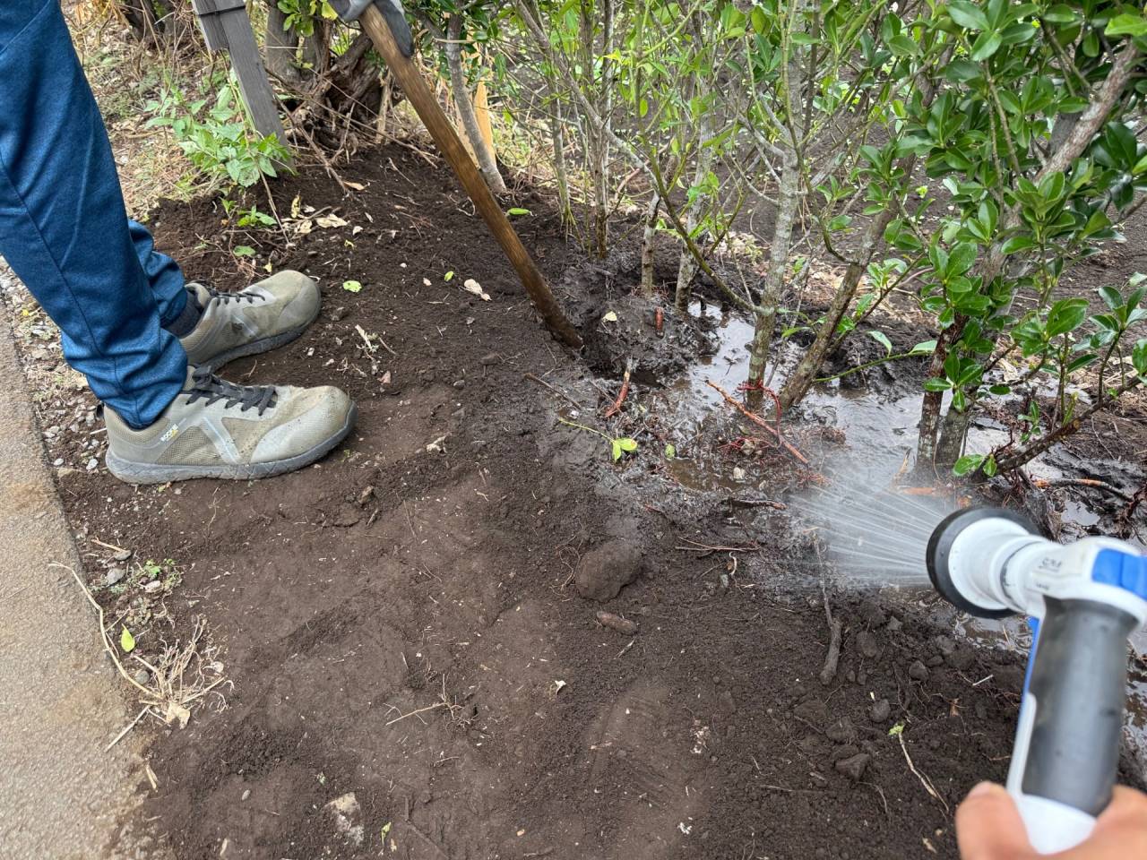 ◆ 今回の作業内容|マサキ植栽と布掛け支柱設置