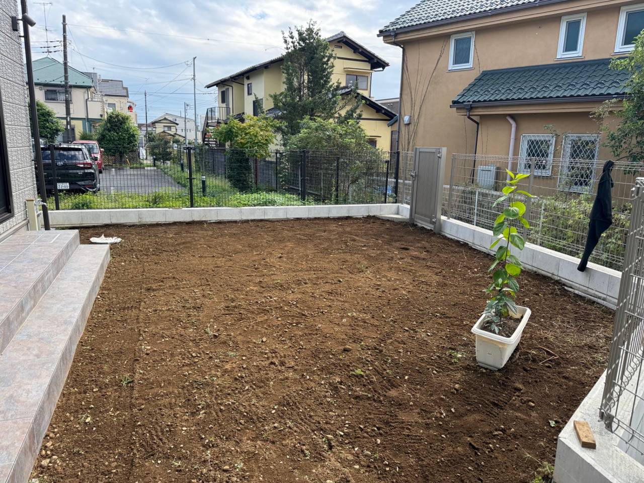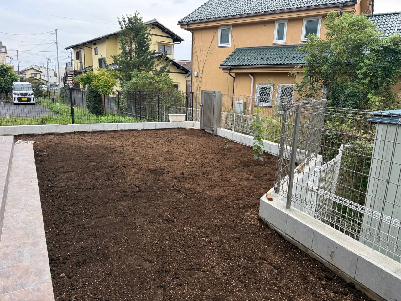 施工実績紹介No.116【座間市さがみ野】芝張り前の床作り作業を実施|小石撤去・土入れ替え・肥料混ぜ込みによる土壌改良