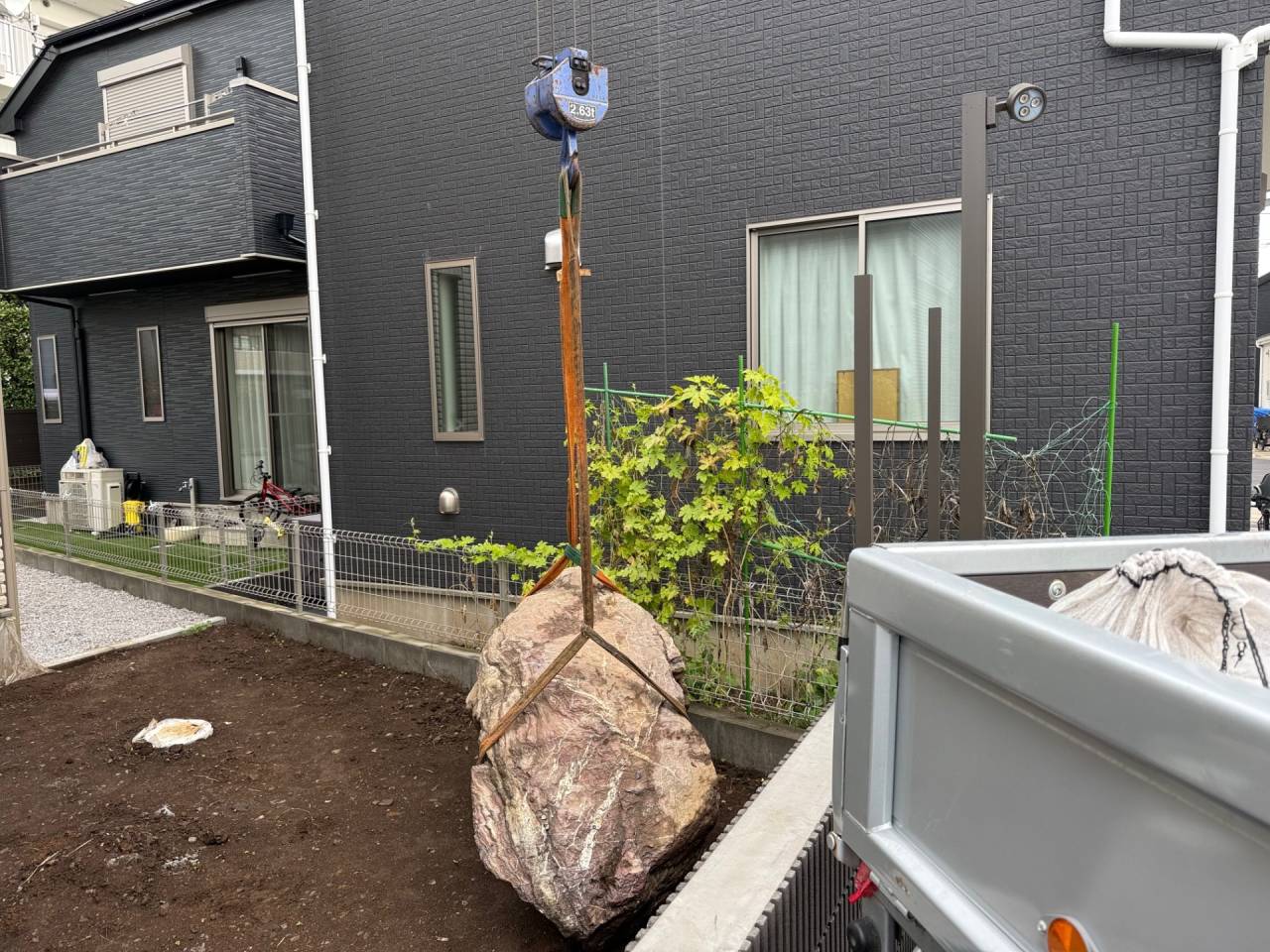 施工実績紹介No.133【大和市渋谷】建て替えに伴う大きな庭石の移動・据え直し作業(クレーン車使用)|安全第一の重量物施工