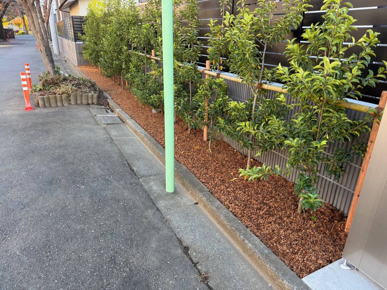 施工実績紹介No.149【大和市下和田】お庭のソヨゴ新植・布掛け支柱設置・ウッドチップ敷き均し作業を実施|管理しやすく美しい庭づくり