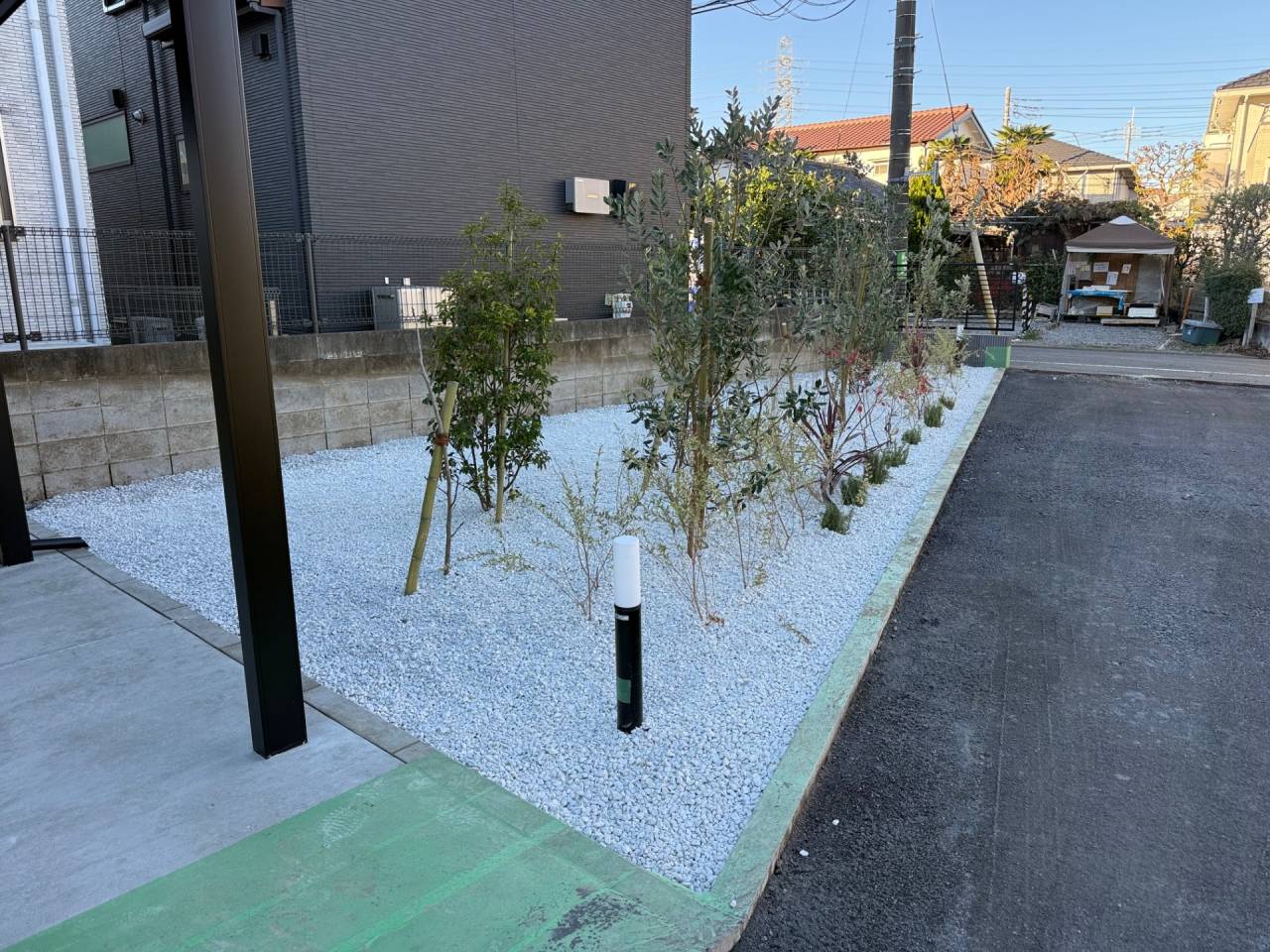 植木20本以上の新植と防草シート・白砕石砂利敷きを同時に行い、