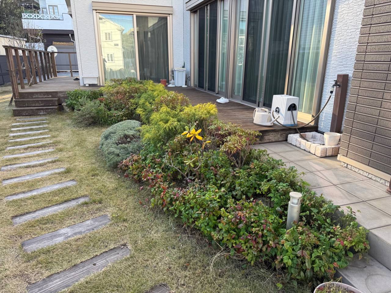 施工実績紹介No.160【横浜市瀬谷区北新】お庭のオタフクナンテン・セダム・ローズマリーなど地被植物を剪定|低木・下草を整え管理しやすい庭へ